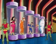 - A female Jabberjaw makes a cameo appearance during the end credits of Scoob! where the character joins The Blue Falcon's superhero team known as the Falcon Force. She also appears on a poster in the Funland Arcade in an arcade cabinet alongside the other members of the Neptunes.