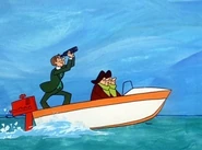 Penelope spends the rest of the episode in a various series of perils, including being chained to a log and headed toward a waterfall, and later climbing to the top of an idol, which the Hooded Claw surrounds with gunpowder. Finally, after Penelope and the mob leave the jungle, she is taken aboard the Hooded Claw's submarine. He straps her to a torpedo and directs it to China. The mobsters rescue Penelope again, and Clyde sends the torpedo "back to its rightful owner", sinking the Hooded Claw's submarine.